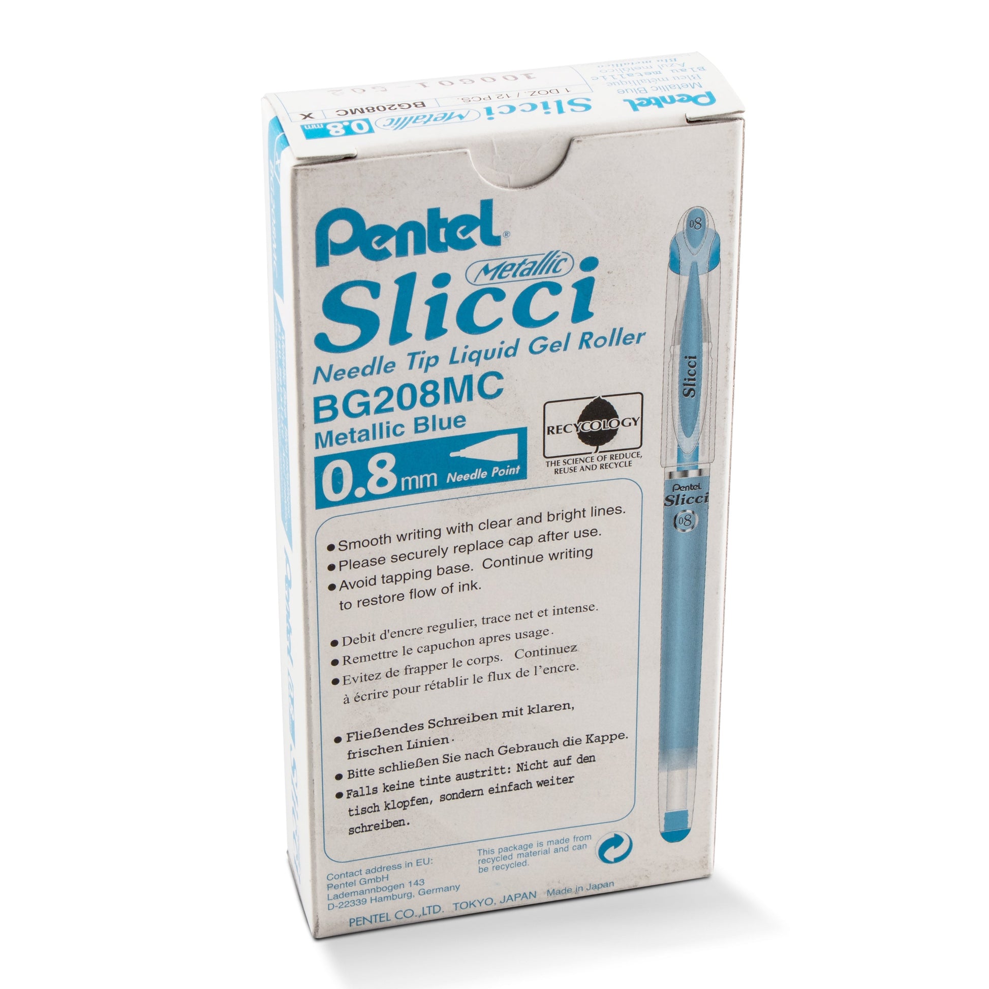 Pentel Arts Slicci METALLIC (0.8mm) Needle Tip Med Gel Pen Blue Metallic Ink (BG208-MC)PENBG208MC-12