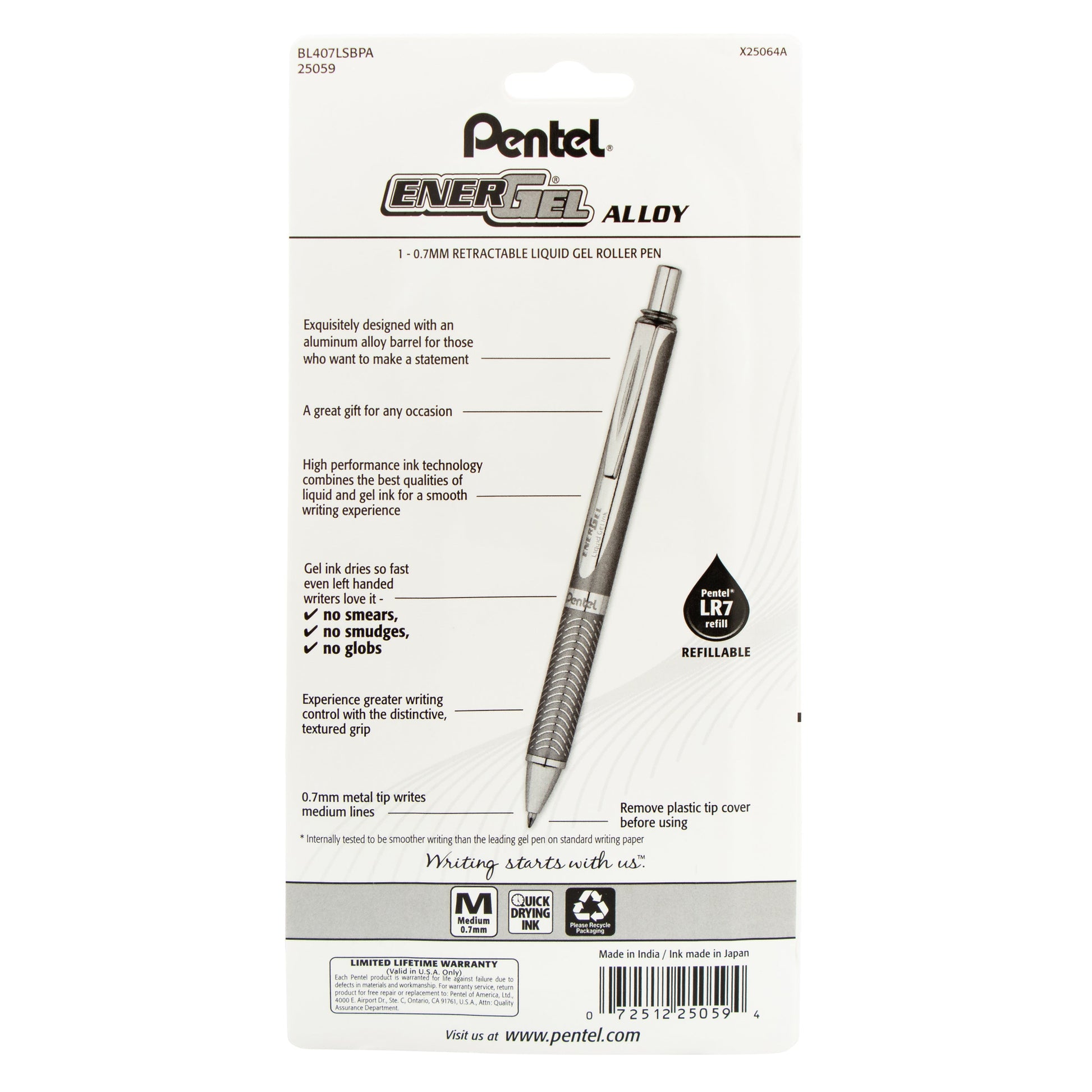 The Pentel® EnerGel Alloy RT retractable liquid gel pen is an exquisitely designed writing instrument designed for those who want to make a statement. High performance ink technology combines the best qualities of liquid and gel ink for a super-smooth writing experience that left handers love – No Smears, No Smudges, No Globs. A great gift for any occasion, the alloy barrel comes in a variety of metallic sheens and includes a distinctive, textured grip for greater writing comfort. The .7mm metal tip writes medium lines and is refillable with any EnerGel refill. It is backed by Pentel’s Limited Lifetime Warranty.