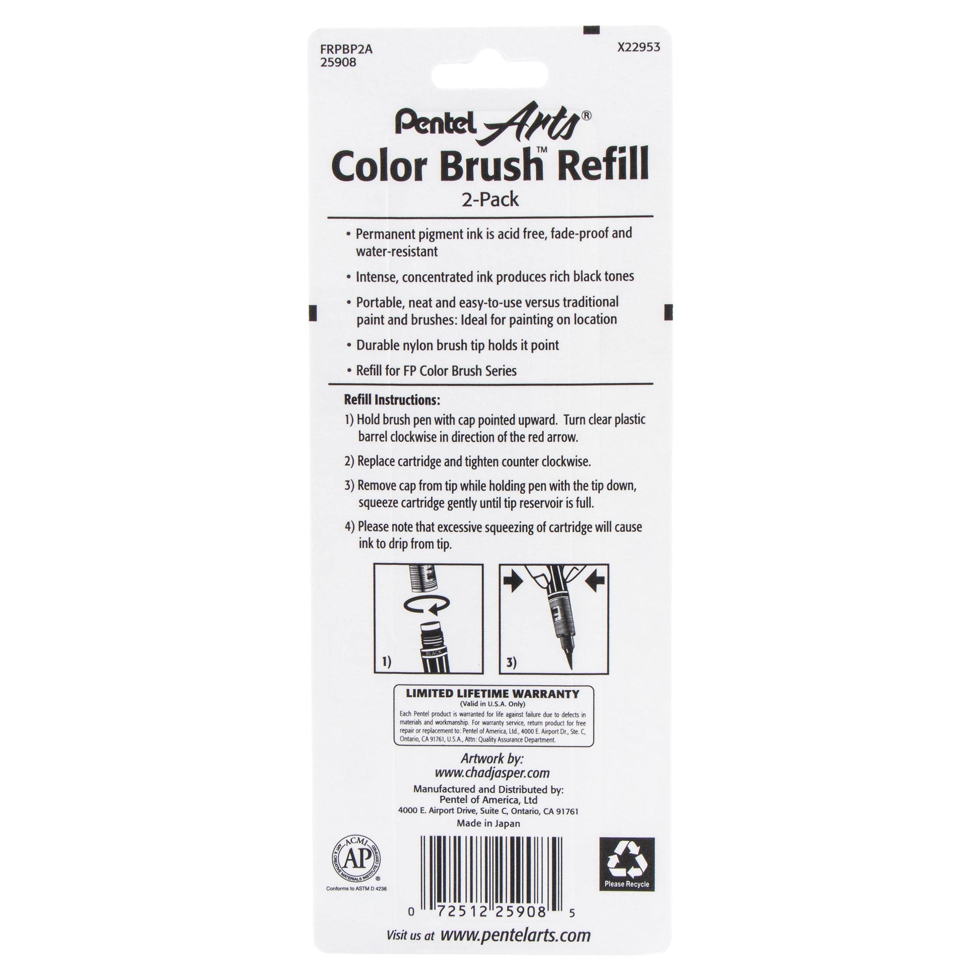 Pentel Arts Color Brush Pigment Refills, Black Ink, 2-Pk (FRPBP2A)