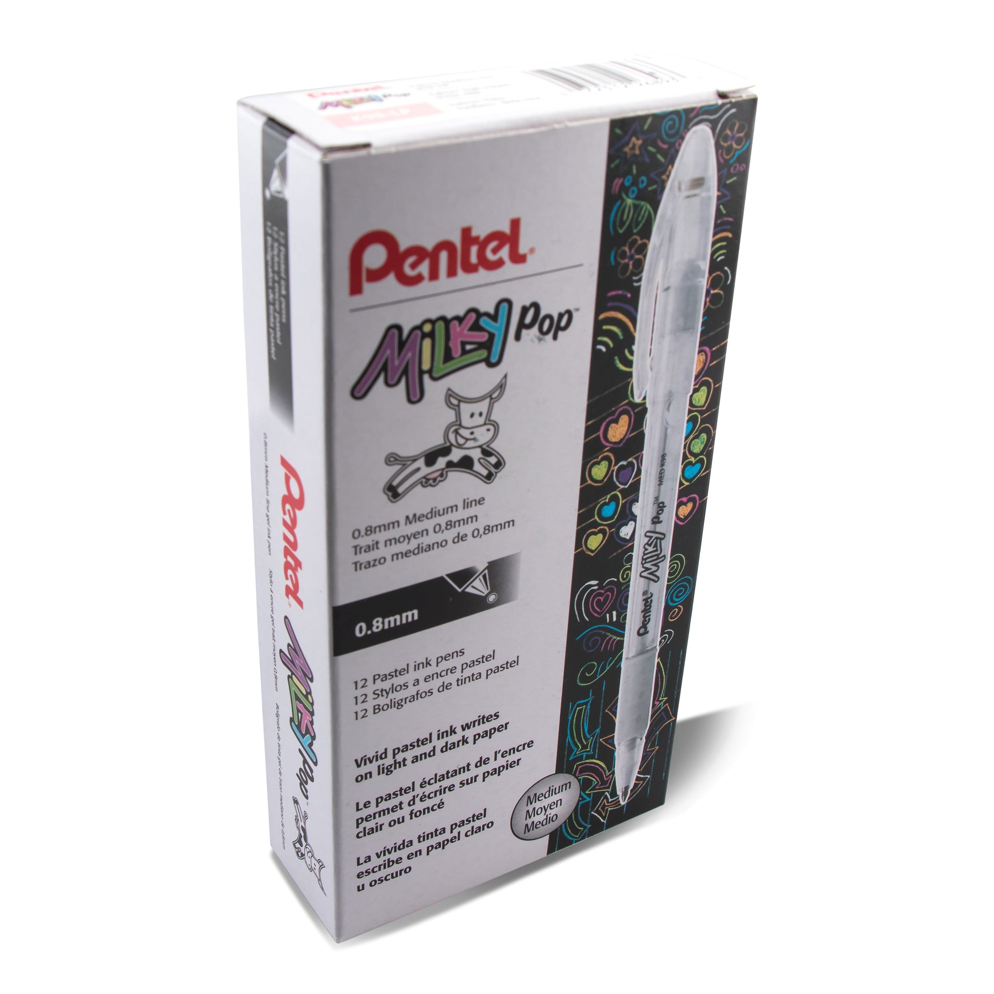 The Pentel® Milky Pop™ gel pens add a “Pop” of color to any page. Milky pastel colors work on light or dark colored paper to make your writing and artwork stand out. Smooth gel ink and extra-long balanced barrel for effortless writing and control. Latex-free grip for comfortable writing and drawing. .8mm metal tip writes medium lines. AP Certified. Backed by a Limited Lifetime Warranty