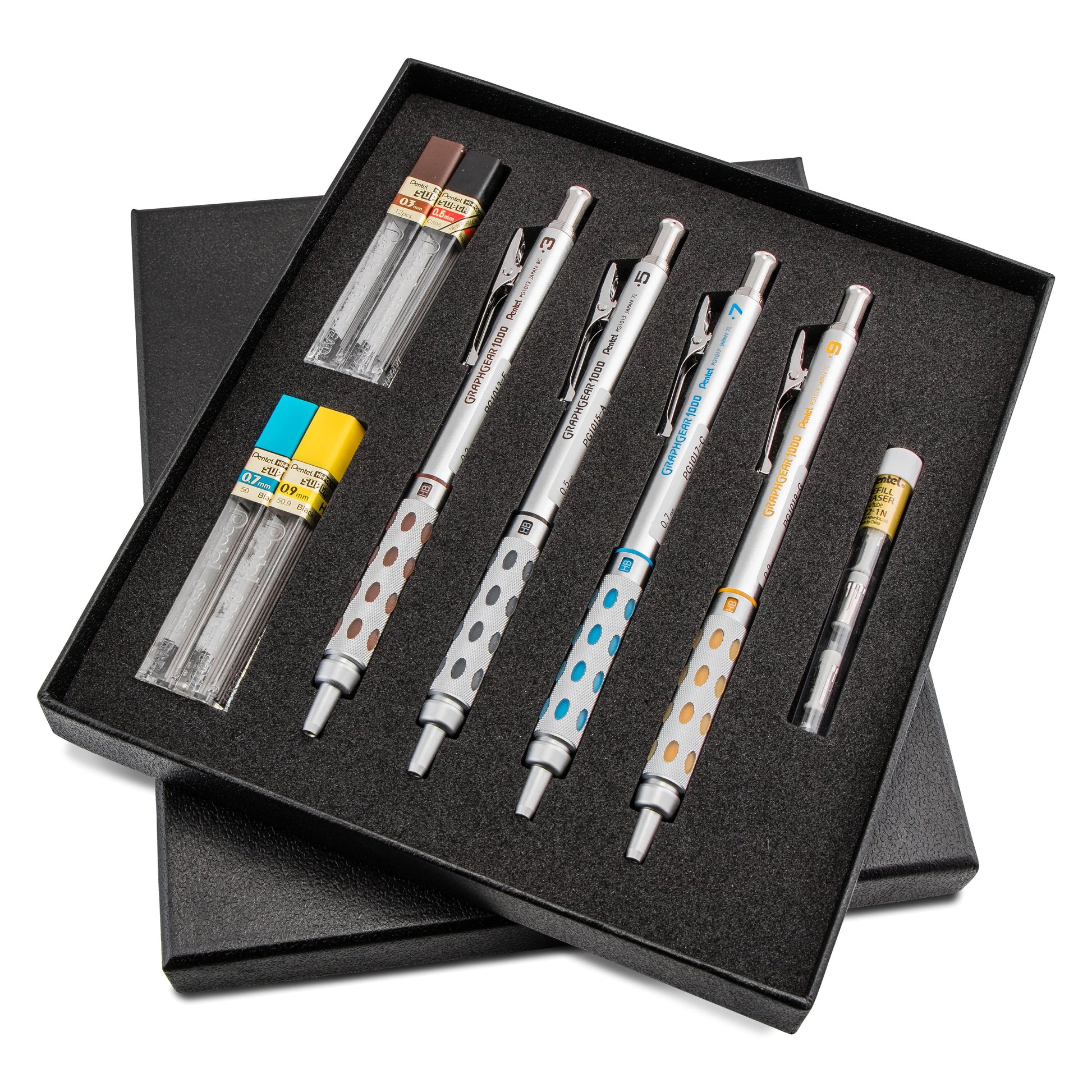Pentel Arts GraphGear 1000 Premium Automatic Drafting Pencil Set (0.3mm, 0.5mm, 0.7mm, 0.9mm), 4 Asst. Leads, Refill Erasers, Assorted Gift Box Set (PG1000BXSET)