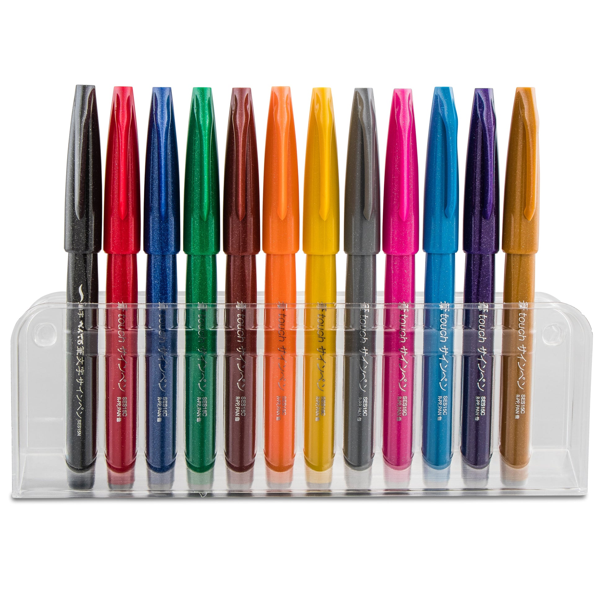 Pentel Arts Sign Pen Brush Tip, Assorted Colors (A/D/F/V/S/G/C/B/E/P/N/Y), 12-Pk Plastic BOX (SES15CPC12)