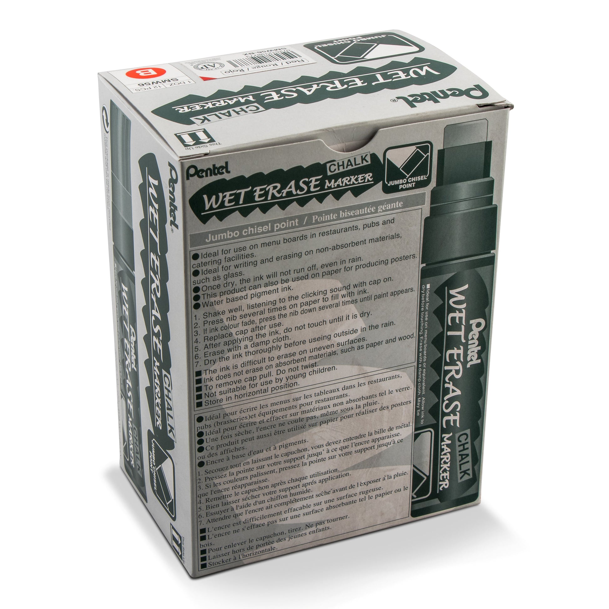 The Pentel Arts Wet Erase Markers feature chalk-based ink that adheres to sealed, non-porous surfaces such as glass, windows, mirrors, metal, plastic and porcelain while remaining opaque. Once dry, the ink remains intact when exposed to raindrops. Turn windows, mirrors and glass into works of art, special announcements or more. Customize plastic containers for easy storage labeling. Ink wipes off with a clean, damp cloth. Available in a variety of colors in chisel or jumbo tip. ACMI Certified Nontoxic.